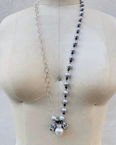 Silver Pyrite Beads: The 15" necklace features silver pyrite beads. The silver elements beautifully complement the soft sheen of the pearls and navy tigers eye, creating a harmonious and chic design.