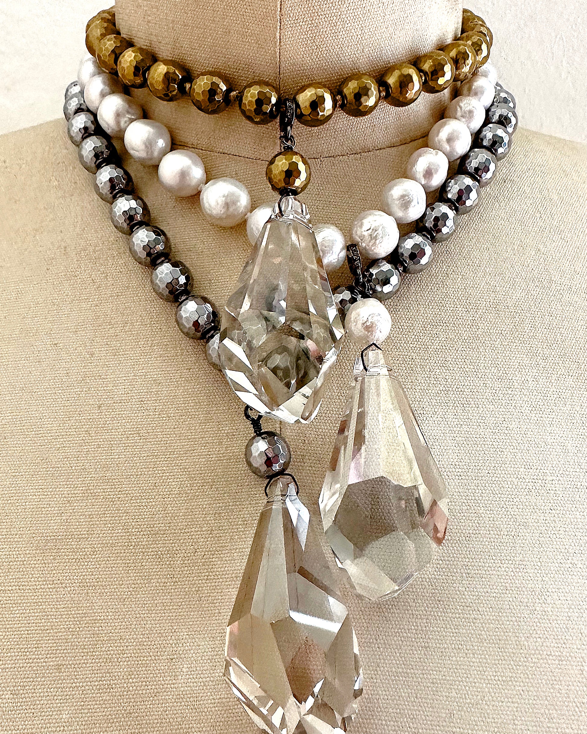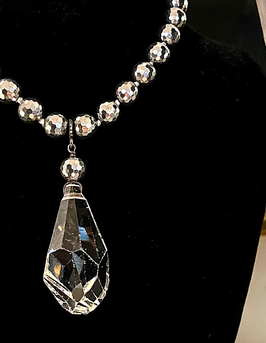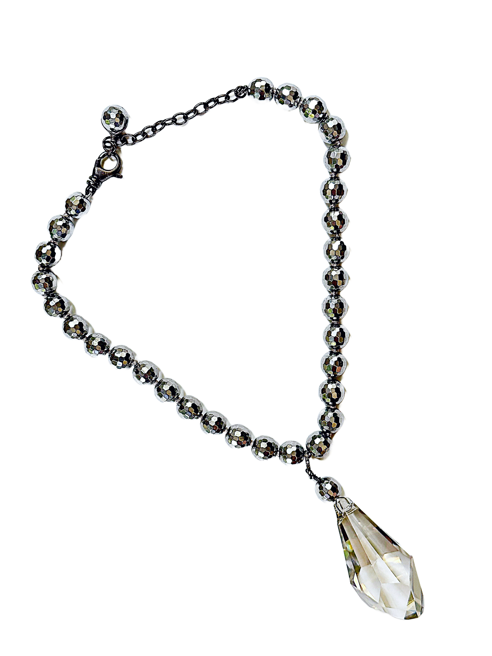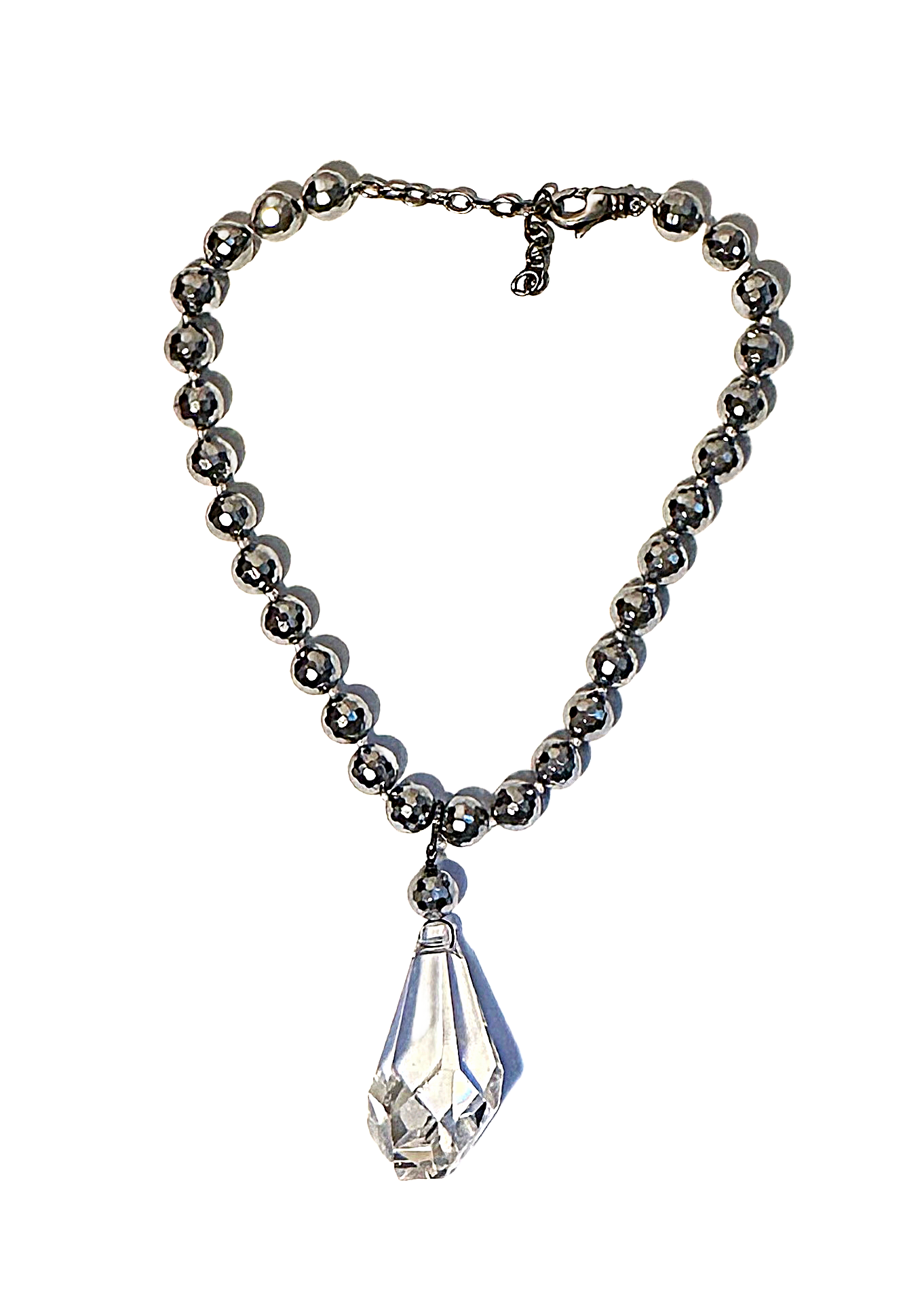 Silver Hematite: The 13"-16" necklace features large silver hematite peals, beautifully complementing the large crystal quartz drop, creating an elegant and chic design.